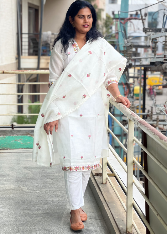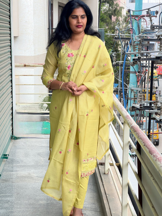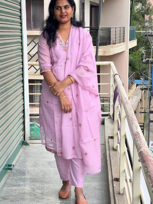 Soundarya - Kota Doria Embroidered Suit - Onion