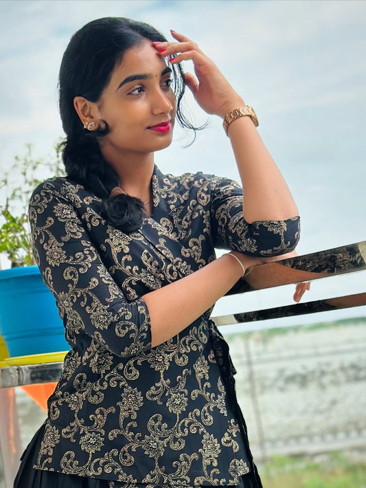 Anvitha - Silk Cotton Printed wrap top and skirt - Black