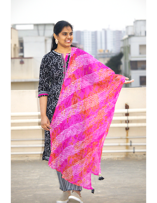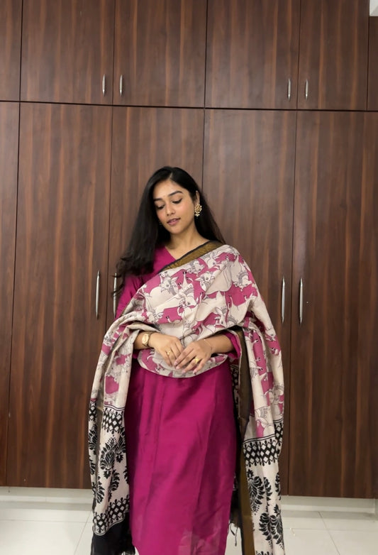 Yogitha - Rani Pink Silk cotton set with Kalamkari dupatta