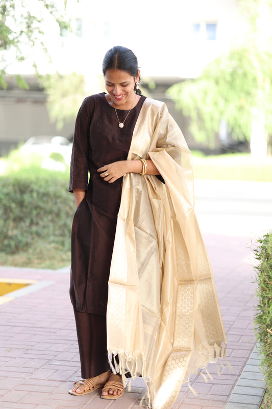Abilasha - Brown Silk cotton set with Tissue dupatta
