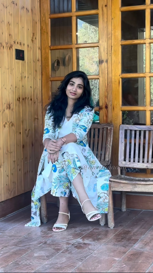 Lathika - Premium Floral Cotton Long jacket kurta set - Beige