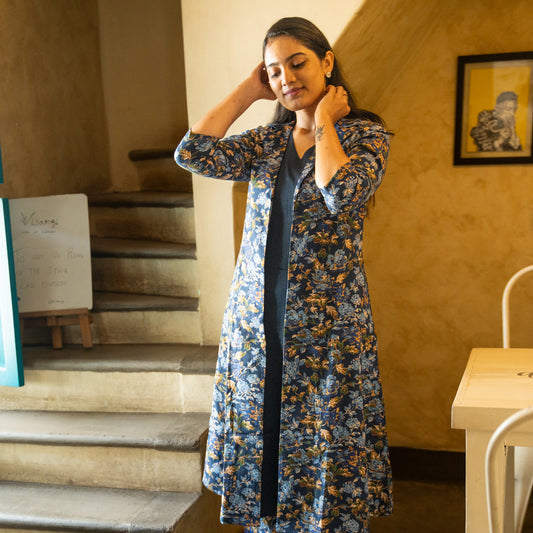 Lathika - Premium Floral Cotton Long jacket kurta set - Navy