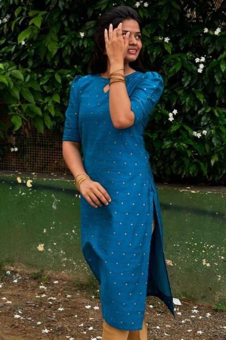Teena - Pure Handloom Cotton High neck Kurti - Blue