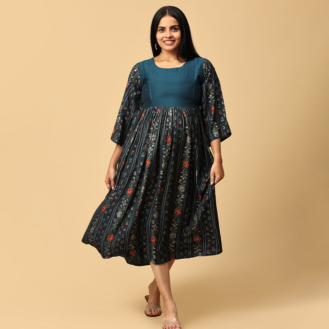 A flowy Black & Red floral dress featuring U neck, designer sleeves and two sides pockets