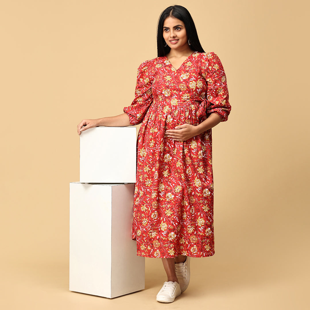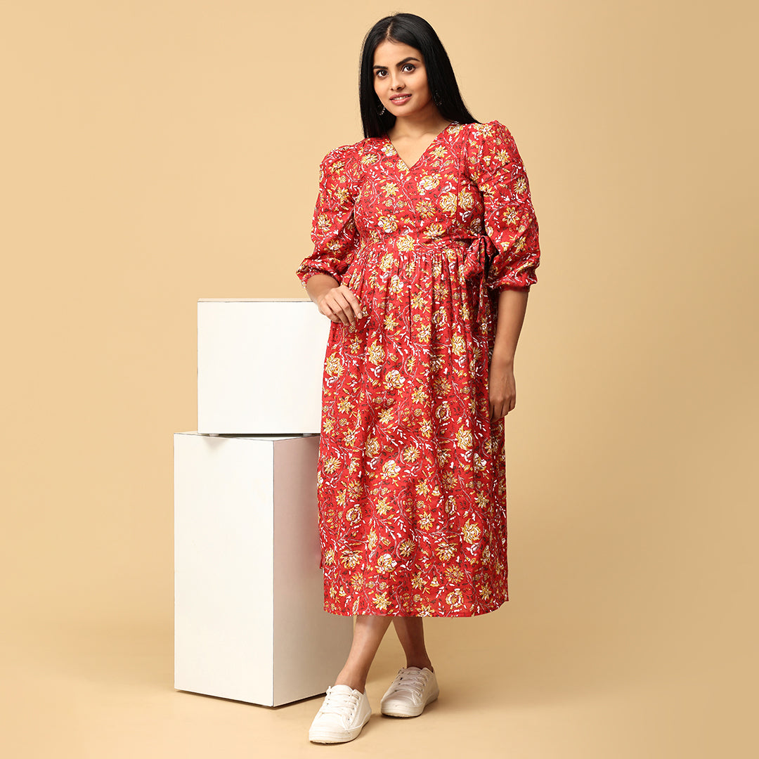 A flowy Premium cotton dress Elevate your wardrobe with the Anjani -Red Floral Premium Cotton dress. Made of high-quality cotton, this dress boasts a flowy silhouette that will make you feel like a graceful flower dancing in the breeze. Enjoy the luxurious comfort and indulgent style of this premium dress, perfect for special events and beautiful days out.
