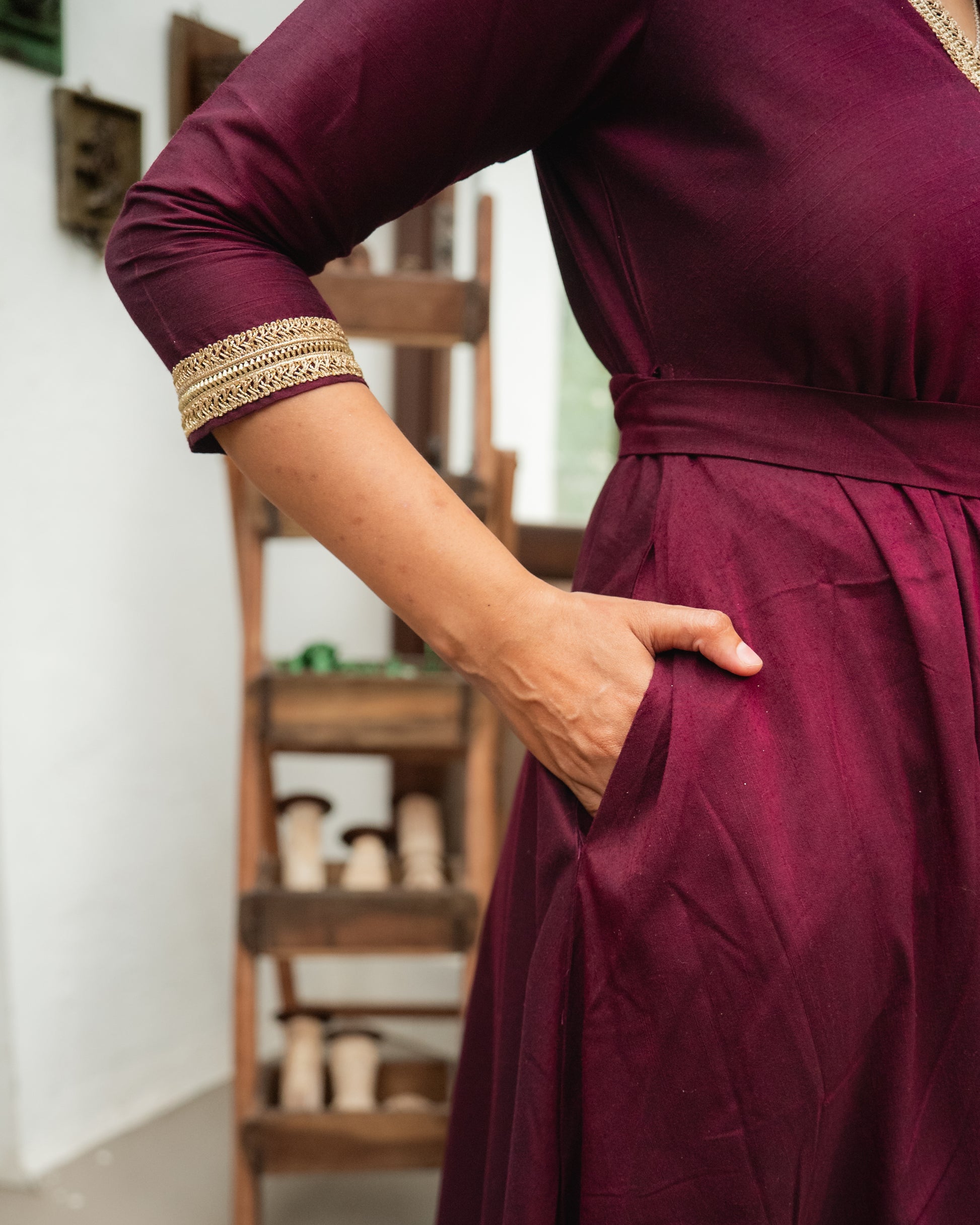 Jabili – Silk Cotton Wrap Anarkali Coord Set with Pants – Wine