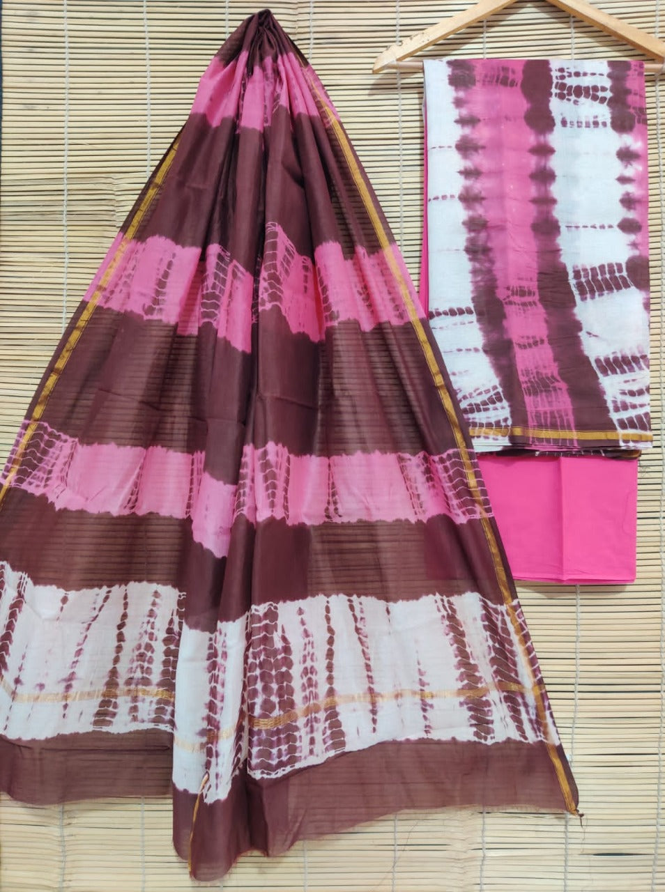 Unstitched Chanderi Block Printed suits - Baby Pink & Brown