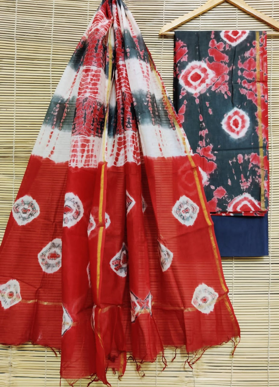 Unstitched Chanderi Block Printed suits - Grey & Red
