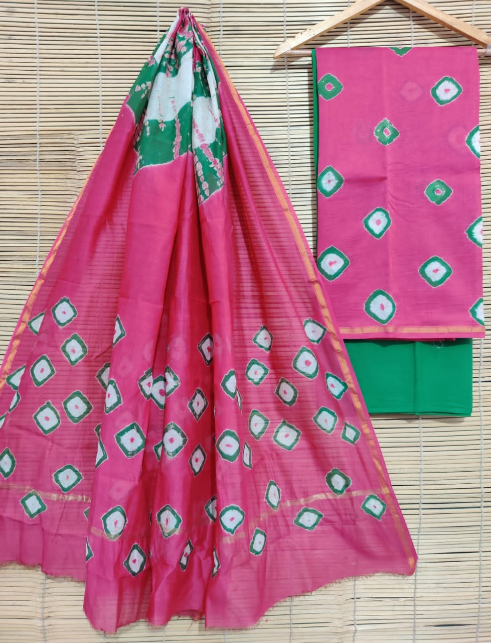 Unstitched Chanderi Block Printed suits - Pink & Green